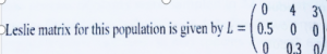 17.Suppose a population has three age classes. Females in the second and third age classes produce four and three offsprings, respectively. While 50% female in the first age class survive into the second age class, only 30% females survive into the third age class. The