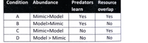 Therefore, the correct answer is the set of conditions where the model is more abundant than the mimic and predator learning is effective—typically represented by Condition A.
