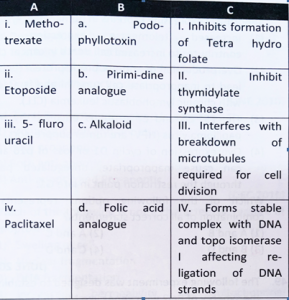 Chemotherapies by anti-cancer drugs are mostly aimed at blocking DNA synthesis and cell division. A list of anti-cancer drugs is given in column A, their chemical nature in column B and their mechanism of action in column C.