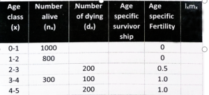 | Age (x) | lₓ (survivorship) | mₓ (fecundity) | lₓ × mₓ |