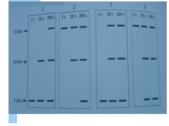 11. An in vitro translation system capable of incorporating ~8 amino acids was programmed to translate a single mRNA that codes for an alanine-rich (35% alanine with uniform distribution of alanine) protein of 275 amino acids (~30kDa) including a hexa-histidine tag at the c-terminal end of the protein. The protein possesses three methionine residues at amino acid positions 1, 135 and 230 and generates polypeptides of ~15 kDa, ~10 kDa and ~5 kDa upon degradation with cyanogen bromide. The translation reaction was initiated and the ongoing reaction was supplemented with 14C Ala after 5 min. Soon after addition of 14C Ala, aliquots were drawn at 2, 20, and 200 s, and reactions in the aliquots were instantaneously stopped. The translated proteins were purified on Ni NTA columns, processed for degradation by CNBr, resolved on SDS-PAGE, and visualized by nonquantitative autoradiography. Which Of the following autoradiograms represents the expected pattern of the bands
