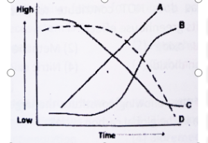 - In a lake subjected to progressive eutrophication,temporal changes in the magnitude of selectedparameters (A, B, C, D) are shown in the graph