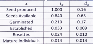The following is the life table of a natural population of a small annual succulent where ‘x’ is its life phase, ‘lx‘ is its survivorship till that stage and ‘dx‘ is its age specific mortality.