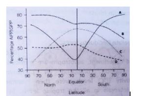 - Which one of the following curves correctly depicts the relationship of the NPP/GPP ratio with latitude?