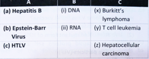 43. Oncogenic viruses could have either DNA or RNA genomes. Listed below are some oncogenic viruses (Column A), their genome types (Column B) and the cancers caused by these viruses (Column C). 43. Oncogenic viruses could have either DNA or RNA genomes. Listed below are some oncogenic viruses (Column A), their genome types (Column B) and the cancers caused by these viruses (Column C).